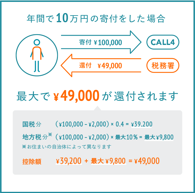 CALL4は東京都から認定を受けた認定NPO法人です。CALL4へのご寄付は、税制優遇の対象となります(CALL4団体への寄付に限ります。各掲載ケースへのご寄付は対象外です)。個人の方からの支援金は、特定寄付金とみなされ寄付金控除等の対象となります。個人の所得税の控除について、「税額控除」と「所得控除」から有利な方を選択できます。税額控除の場合、下記の図のとおり、確定申告を行うことで、所得税額から約40%が控除されます(年間所得の40%、所得税額の25%を限度として控除が認められています)。お住まいの自治体によって、一部の住民税も寄付金控除等の対象となる場合がございます(最大10%)。詳細はお住まいの自治体にお問い合わせください。