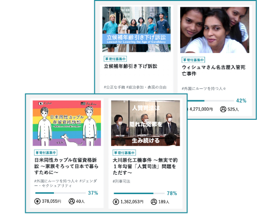 不合理なルールや仕組み、不正義を是正するために「公共訴訟」に立ち上がる人々がいます。私たちは、そうした人々を支えます。訴訟の背景や意義を伝え、寄付などの方法で、気軽に公共訴訟に関われる方法を提供しています。